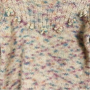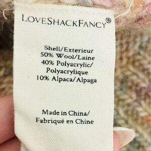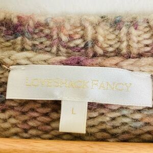 LoveShackFancy tan, cream and pink marled weave with fringe and popcorn texture. Puff sleeves. Wool blend. Tagged as Large but appears to be more like a medium fit. Still has stretch and doesn’t appear to be shrunken.