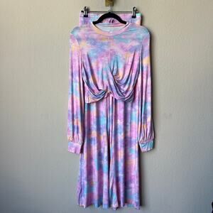 LoveShackFancy x Beach Riot 'Marley' pastel tie dye lounge set. Set includes a crew neck long sleeve crop top with twist front detail and high waisted wide leg pants with drawstring waistband. Super cozy and perfect for days at home, relaxation, or travel. Size medium.