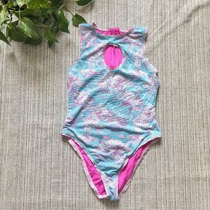Blue and pink metallic glitter mermaid toile/chinoiserie print one piece swimsuit.