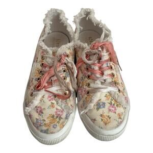 From the Superga x LoveShackFancy Collaboration. Floral canvas sneakers with frayed trim and lace-up vamp.