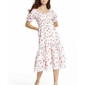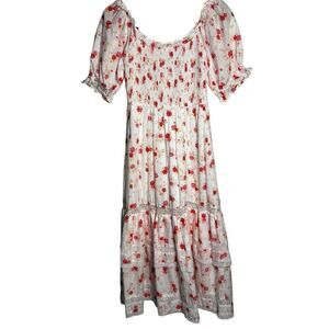 Romantic and feminine, this LoveShackFancy x Target Gemma Dress is new with tags and ready to wear. Designed in crisp white with red and yellow floral print, it features a smocked bodice for a flattering fit, puff sleeves with ruffle cuffs, and a tiered skirt trimmed with lace. Perfect for cottagecore, summer parties, or a Bridgerton-inspired look.