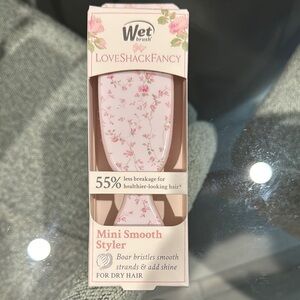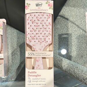 Wet Brush LoveShackFancy set includes a Paddle Detangler and Mini Smooth Styler. Features a floral design in pink and white in style “ Rosa Beaux”