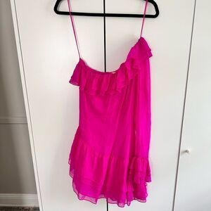 Vibrant as ever, this flirty mini features a one-shoulder style designed with silk chiffon. An easy slim body sweeps into a beautiful bell silhouette graced with sheer ruffles along the asymmetrical hem, neckline, and cuff. This piece includes a side seam zipper for functionality.