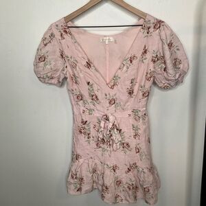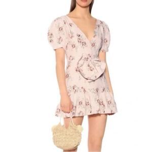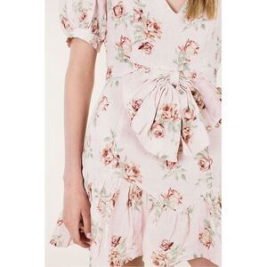 The Lena dress in linen with hand painted French roses, can be worn with the bow in the front or in the back. On the fitted bodice, a deep V points to a prominent bow at the waist. Gathered shoulders give way to elongated puff sleeves, adorned with a classic turn-up. The top panel of the skirt has inset princess seams that extend to the V's. The bottom ruffle is gathered at the top and reaches mid/upper thigh.