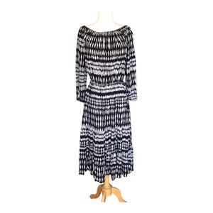 • Featuring a black and taupe kaleidoscope print, this midi dress can be worn on or off the shoulder for a customizable look. The adjustable side drawstring waist creates a flattering silhouette, while the elastic wristbands add a touch of comfort and ease.