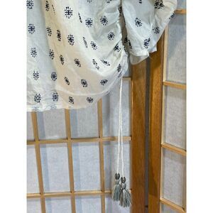 Side ruching with tassle accent. 3/4 sleeves. Tie collar. 100% cotton. Hand wash.