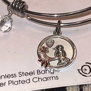 Stainless steel bangle. 3 Silver plated charms.