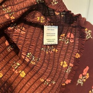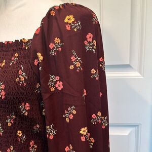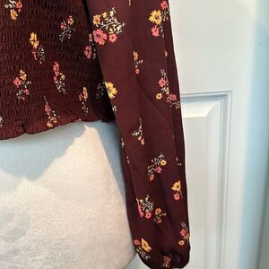 New without tags (NWOT) but in original packaging. Love Tree cropped blouse in maroon with a yellow and orange vintage floral pattern. Perfect for a summer outing or picnic with shorts or a mini skirt and cowgirl boots for a festival or concert look. Or, transition to fall for family photos in the stunning colorway. Front and back are identical with square neckline that can also be worn off the shoulder. Lots of flounce in balloon sleeve with cinched wrists and front and back at midsection is smocked for a comfortable wear.
