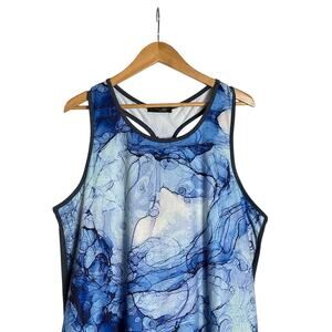 • The front showcases a mesmerizing marble-inspired print in shades of blue and white, creating a fresh, artistic look. The back features a contrast solid charcoal panel with soft gathers and a cut-out racerback design for added comfort and breathability. Lightweight and flowy, this tank moves with you—perfect for workouts, yoga, or casual wear.