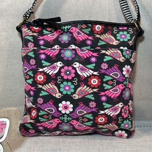 Colorful lovebirds on s black fabric background. Has two slip pockets inside, one large saddle type pocket on frontside and one large magnetic snap pocket backside and adjustable strap. Trimmed in black leather. Trimmed in black leather.