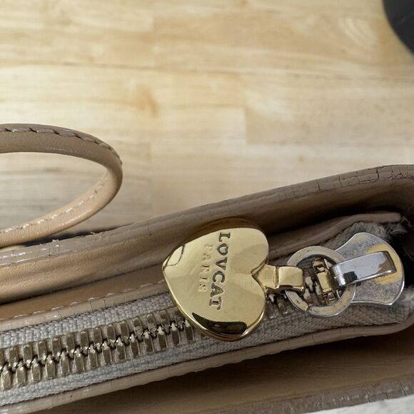 Smooth leather outer with heart print fabric lining. Inner Zipper pockets and two open pocket. Very pretty.