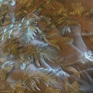 Beige ("truffle") and gold dress. Skirt is medium length (above-the-knee). Lace detail on skirt subtle and beautiful. Size is US 20/UK 24, would recommend for a bustier woman due to the fact that the dress is roomy in the bodice. Worn once for company Christmas party, dress like-new. Very cute with back tights and black cardigan.