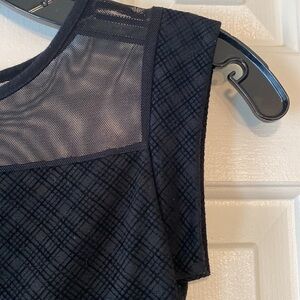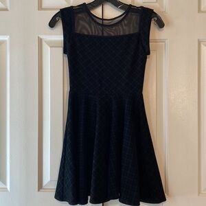 Beautiful dress perfect for a party or other special occasion. Black on black criss cross pattern throughout with sheer top. Skirt part flares a bit to make this a great spinning around dress. In excellent condition.