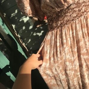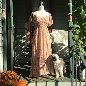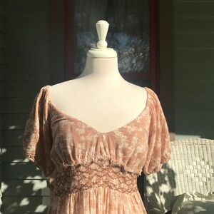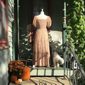 Lovely boho Free People maxi dress in size S. The material is soft and comfortable, 100% cotton. Sweet puffed sleeves and smocked stretchy waist, could fit a slightly larger size. Features a tiered skirt and pockets. In great used condition. Flat waist measurement is 14” and from shoulder to hem is approximately 52”.