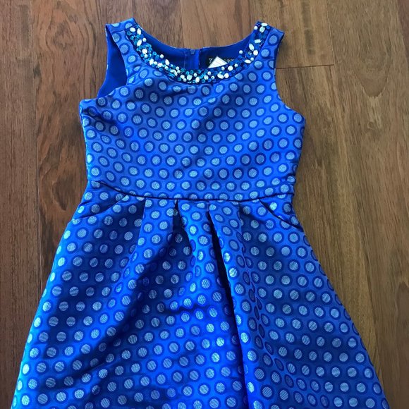This sleeveless dress is cute and shiny with pearl and rhinestone embellishment around the collar. And even better, it has pockets!