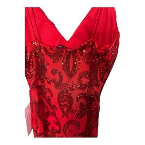 Stunning red dress with intricate sequin design. Perfect for evening wear. Spaghetti straps and deep neckline.