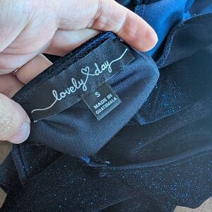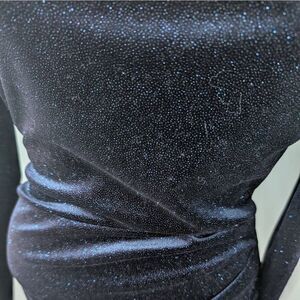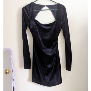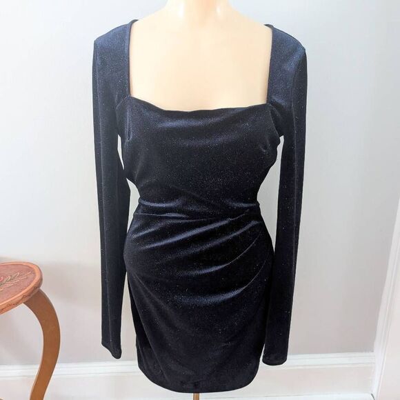 Lovely Day Long Sleeve Blue Glitter Velvet Dress. Square neck and open back. Dark blue with sparkles. Above the knee.