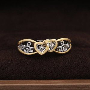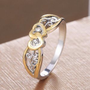 ✨ Lovely Double Heart Carved Flower Two Color Plated Rings for Women, PD697