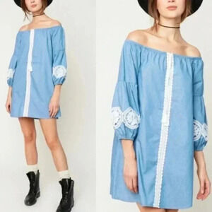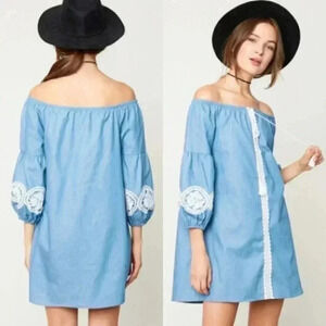 Lovely Light Denim dress, off shoulder style, tie at neck, adorable sleeves as seen ad lace details