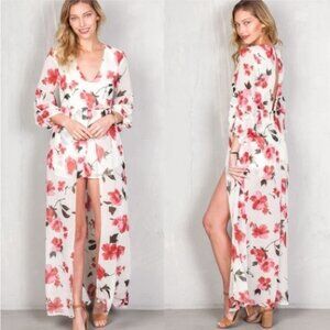 Goregous light weight and flowy romper with skirt/train. sheer sleeves and trail. lined at shorts. perfect for the season!