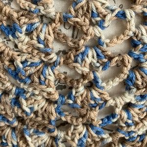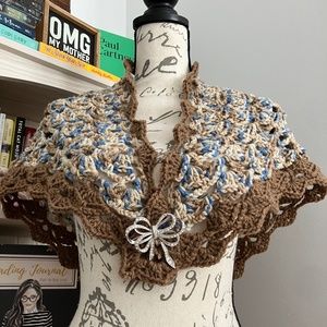 Handmade crocheted shawl in lovely shades of blue, brown, tan, and cream. This pretty, and functional, shawl is perfect with dressy and casual styles and keeps you warm on chilly evenings. With a vintage yet contemporary look, it is very versatile (see styling options above!) and will flow from season to season. Made of acrylic yarn, it is machine washable on gentle/delicate cycle in cool water. Reshape to dry or gently hang. Measures approximately 40 x 34 x 34. There is a bit of stretch to the yarn.