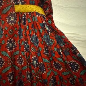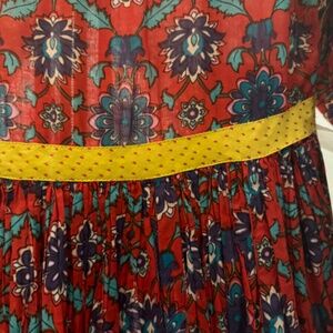 Beautiful Indian textile cotton printed dress, from Vintage Earth, a boutique in Bombay, size small. Dress features delicate gathered fabric for a fill flowy skirt on sides of dress and around back, and yellow trim along neck, down front, at sleeves and at hem. Such a head turner and so easy to carry, on its own or with tights in cooler weather. Cotton is unlined and may need half slip if opting to wear this as a dress. Gentle wear, sad to part with this beauty!