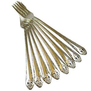Set of eight silverplate grille forks in the Lovely Lady pattern by Holmes & Edwards Inlaid, a division of International Silver. Produced circa 1937-1959, this elegant floral design features a pierced tip with twin openings and raised scrollwork along the handle. Each fork measures approximately 7 ¾ inches long.