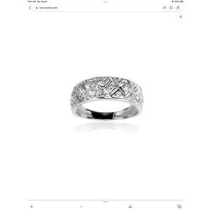 There is lots of sparkle in this unique design! This gorgeous band ring is done in a trendy zig zagged lattice design and sparkles with .60 carat of AAA quality simulated diamond gemstones. It is high polished and designed with 2.4 grams of .925 solid sterling silver and is stamped for authenticity. It is 1/3” in width and is size 9. We also have one listed in size 8.