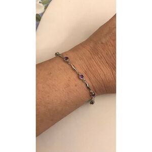 Gorgeous is the word on this bracelet! It looks great worn alone or layered with your other favorites. A total of five (.20) carat round cut bezel set genuine amethyst gemstones are set in a pretty twist station link design. The total gem weight is one carat. It measures 7.25” in length and has a lobster claw clasp closure. It is done in .925 solid sterling silver and has then been layered in platinum for a lifetime of shine and durability.