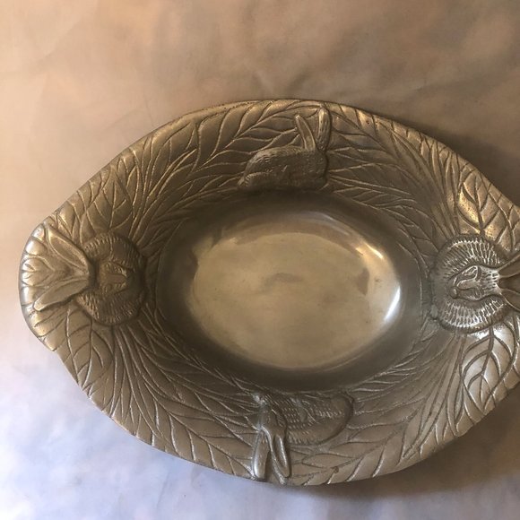 This is a lovely aluminum alloy metal bowl. Can be used to serve hot or cold foods or even bread or fruit. Beautiful rabbit motif. Measures 13.75" x 9.5" x3.5" tall. Ships USPS