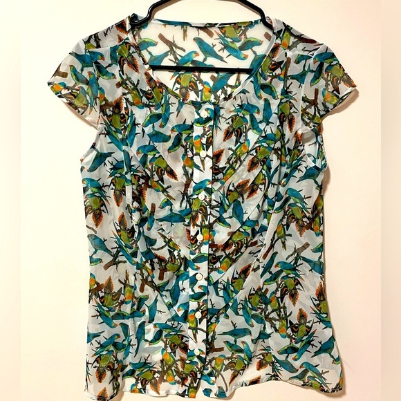 Lovely Sheer Tropical Birds Cap Sleeve Button Down Women’s M
