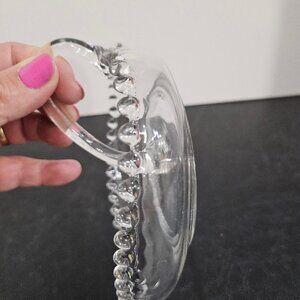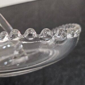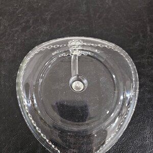 This very lovely vintage glass candy/trinket dish has a very pretty round beaded design along the top edge of the heart shaped bowl. Has a graceful, curved, clear handle. This piece is clear, glossy and delicate, adding an elegant touch to any room. Made by Imperial Glass Company circa 1930s. It is in great condition. No chips, scratches, necks or flaws. Measure 6 inches long, 5 inches wide, 2 inches tall. Non smoking, pet free home. ERC#4