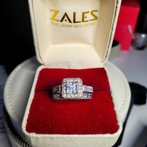 This Set Includes the engagement ring which has a 1.5ct Princess Cut Lab Created Diamond center stone
