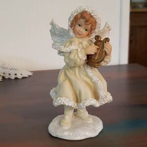 Lovely Vintage Resin Angel with Harp Figurine and Sparkly Wings