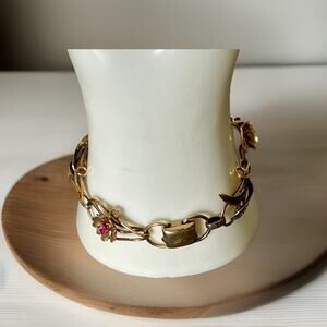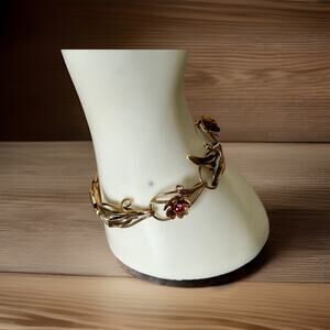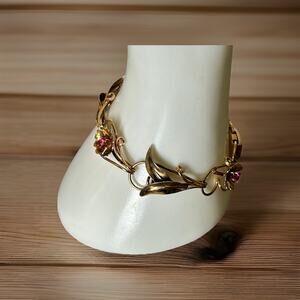 This Lovely Vintage 1/20 12k Gold Filled Copper Bracelet by Regal is a stunning piece of jewelry for any occasion. The flower-shaped bracelet features a snap closure and is signed by the brand. With a beautiful pink crystal main stone and a classic chain style, this bracelet exudes love and elegance. Made with high-quality materials, including copper and crystal, this vintage bracelet is a timeless addition to any woman's jewelry collection.