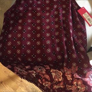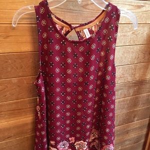 Boho tank size X-small with burgundy, black and pinks open back and button closure at neck.. The scallop detail on the bottom is a nice touch. I have this in another color and am in love with the cut across the shoulders 💜
