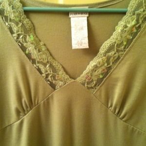 Light olive green color with lace at V. Lace has a few sequins and beads in it. Short sleeves. Very pretty. 45 polyester 45 rayon 10 spandex