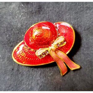 Lovely unsigned Red enamel hat pin. Adorned with a pink ribbon with tiny amethyst rhinestones.