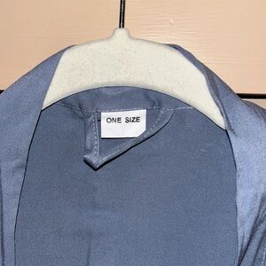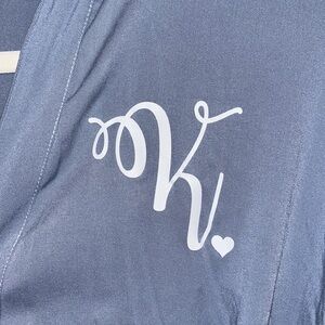 In like new condition, one size. Color is a blue grey, soft. Letter K is white. Has inside tie and original long tie for robe closure