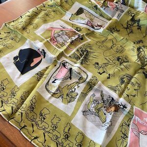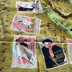 Lovely Vintage Hand Screened, Hand Rolled Silk Scarf with a Paris Motif, Jardin de Paris, May Milton, Moulin Rouge, Aristide Bruant & Jane Avril. In Green and Pink. Measures 30”x 30”. Tag is frayed otherwise EUC.