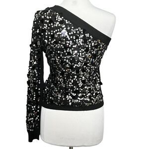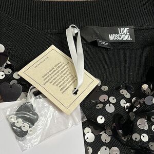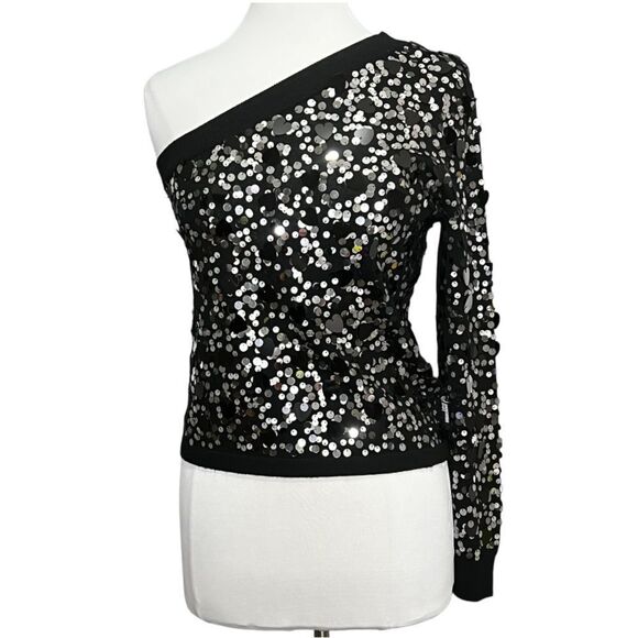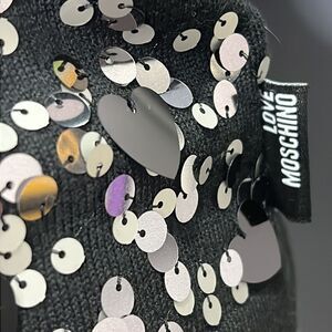 Sparkly Black Multi Pailette & Heart Sequined One Sleeve Asymmetrical Sweater Allover Sequin One Shoulder Jumper Love Moschino