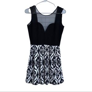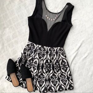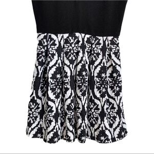 Lovers + Friends dress with black bodice and graphic print pique knit detail skirt. Boat neckline with sweetheart dip