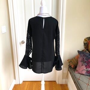 Beautiful black top, all lace, long sleeves with flow flared, tie cuffs, very cute, single button, back closure