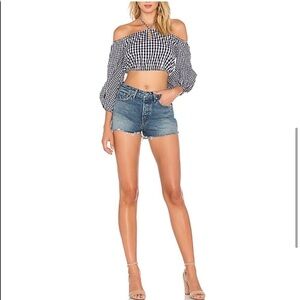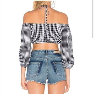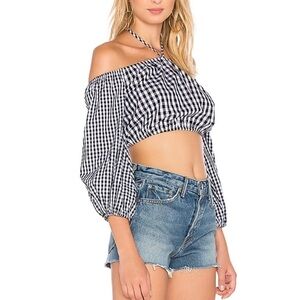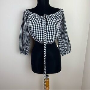 Excellent Preowned condition, size small. Lovers & friends. Black and white gingham patterned off the shoulder top. Tie front. Elastic gives this piece a flattering look.