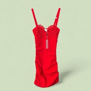 The Lovers and Friends Ashlene Mini Dress in Red is a stylish and bold choice for any party or cocktail event. Made of nylon and viscose, this sleeveless dress features a solid red color with a strappy sleeve design. The pullover closure and short length give it a trendy and flattering look, perfect for a night out. With its chic brand and size S, this dress is sure to make a statement for any woman looking to stand out.