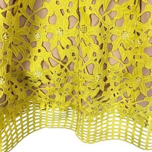 Be the belle of the ball in this stunning Lovers + Friends Bellini Yellow Lace Crochet Mini Cocktail Party Dress. This dress features a beautiful floral pattern that is perfect for any formal occasion. The sleeveless design and V-neckline add a touch of elegance, while the zip closure ensures a secure and comfortable fit. Made from a blend of polyester, spandex, and polyester blend, this dress is both stretchy and comfortable. The lace fabric type and crochet accents add a touch of sophistication, making it the perfect choice for a wedding, party/cocktail, or formal event. This fit and flare mini dress is available in size M and can be hand washed easily.
