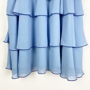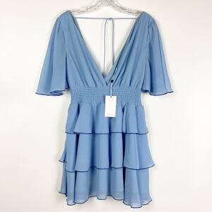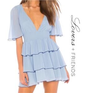 Lovers + Friends Billie Mini Dress in Baby Blue. Lovers + Friends introduces a cocktail hour sensation with the Billie Mini Dress. Romantic and chic, the fit-and-flare silhouette is defined by a sophisticated powder blue shade with dainty ruffles that cascade along the full swing skirt.. Self & Lining: 100% poly. Hand wash cold. Fully lined. Flutter sleeves, smocked elastic waist and tiered flounce overlay. Back cut-out with tie detail. Sold at Revolve. Size XXS. New with tags. Please see measurements for proper fit.