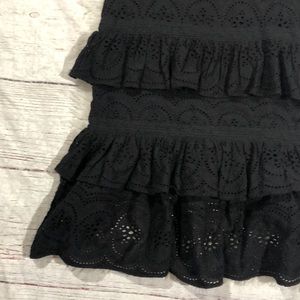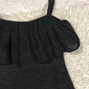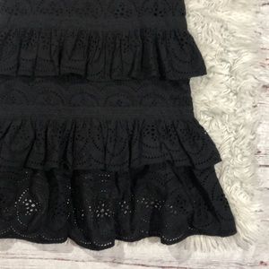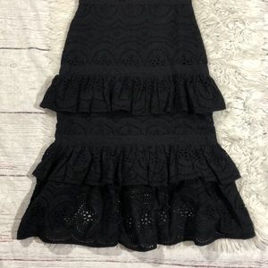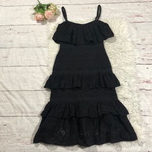 Elegant black lace midi dress. Features tiered ruffle design. Perfect for any occasion.