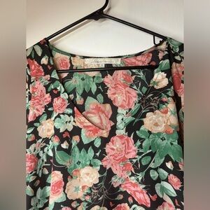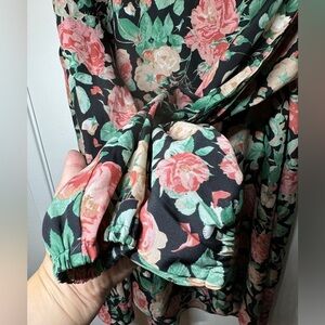 Black with a rose floral print in cream, pink, and green. Print is very 90s. Cold shoulder/arm long sleeves, v neckline, unlined, mini length, slight high low hem, elastic cuffs, Cottagecore, feminine, garden party, cocktail, English garden, flowers
