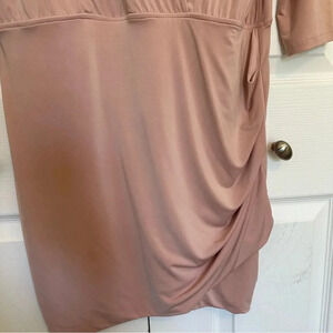 Very smooth slinky silky feeling material, Surplice top that creates deep v neck line, light blush pink color, 3/4 length sleeves, party dress for cocktail attire, bridal shower or wedding, Excellent used condition